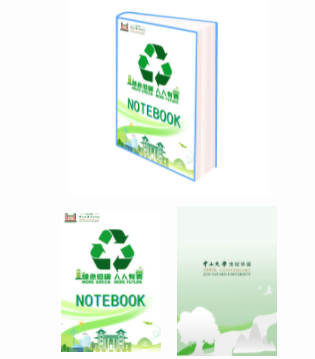 设计理念:封面左上角放置了中山大学百年校庆logo,献礼母校。封面中间突出展示了一个大型绿色回收标志,象征着环保和资源循环利用的理念。下方有一句中文标语:“绿色低碳 人人有责”,以及英文标语“More Green More Future”,传达了每个人都应为环境保护和可持续发展尽一份力的理念。封面下半部分以绿色为主色调,描绘了中山大学特色的怀士堂和中山大学深圳校区特色的图书馆剪影等,美观大方,通过视觉元素向人们传递了绿色环保的重要性,鼓励大家共同关注并践行环保行动。笔记本的背面则是镂空的山、水、树、鸟。警醒我们如果不爱护环境,那么大自然就会逐渐消失。此外,镂空处融合了材料学院专业特色,在紫外灯的照射下,可以还原出山树的青色、水的蓝色和鸟的黄色(空白区域涂覆稀土发光材料),并可以显示出“SYSU”的logo。该笔记本可以用于记录日常生活中的环保心得、低碳生活小技巧或者是有关可持续发展的学习笔记,既实用又具有教育意义。