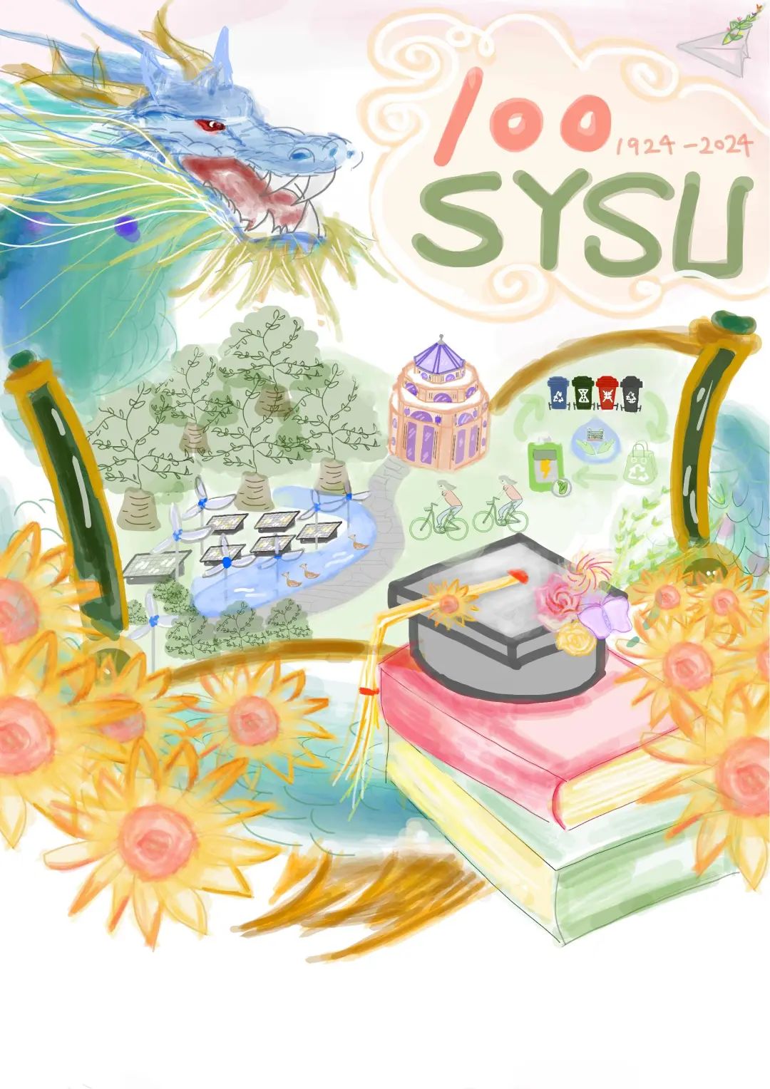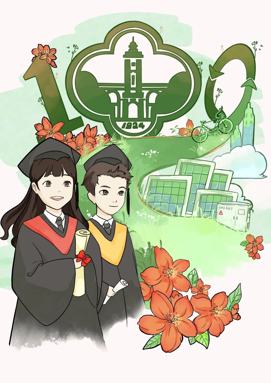 设计理念:画面中,绿色植物象征着生机与环保,绿色作为主色调,也象征了百年传承的“中大绿”。中心部分的校徽与校园建筑,代表着中大的悠久历史和教育精神,提醒我们在追求绿色发展的道路上,传承智慧与创新的重要性。校徽和数字形成了“100”,围绕着火红的木棉花,以庆祝中大百年校庆。下方太阳能板和新能源储能设备,代表新能源对实现碳中和的重要作用,毕业生们朝气蓬勃的身影,寓意着新一代在实现碳中和梦想中的使命与担当。