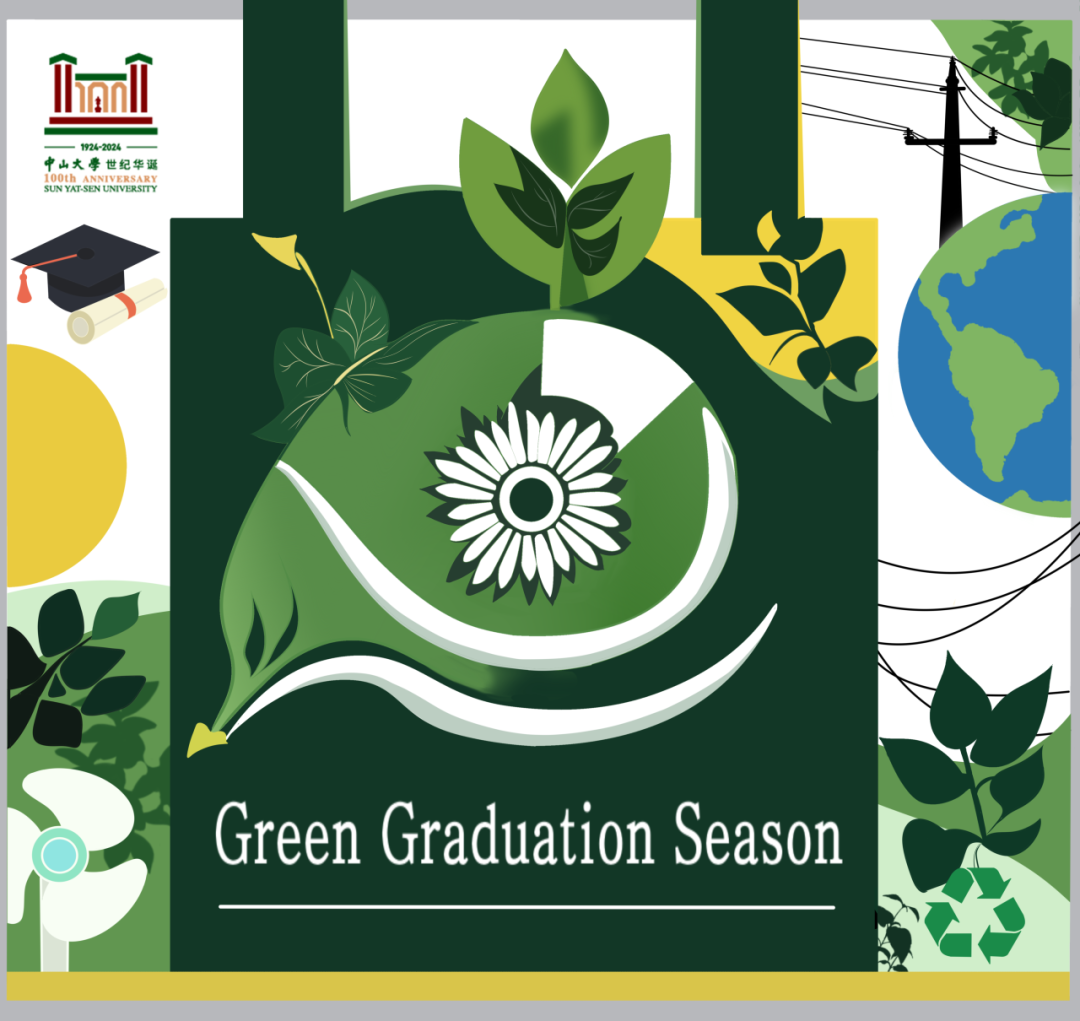 推广文案:这幅作品以绿色环保和双碳(碳达峰、碳中和)为创作核心,结合了中山大学百年校庆和毕业季的元素,展现了可持续发展与青春梦想的交融。希望唤起观众对于环境保护的思考和行动,以中山大学的百年精神为指引,共同迈向绿色和谐的未来。
