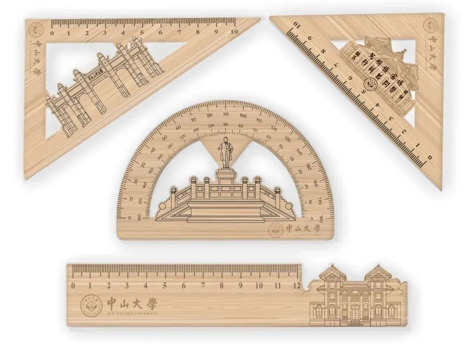 设计理念:《尺绘中大》文创尺子套装融入了中山大学的标志性建筑,以坐落于中山大学南校园中轴线上的怀士堂、校训墙、北门牌坊、孙中山铜像为基础创作而成绘图尺四件套。直尺上的图案是怀士堂,孙中山先生曾在怀士堂作长篇演讲,勉励青年学生,“立志要做大事,不可要做大官”,这铿锵有力的字字句句,回荡于当年的小礼堂外,激励了广大中大学子。三角尺上分别是校训墙和北门牌坊,“博学 审问 慎思 明辨 笃行”是孙中山先生于1924年11月11日在广东大学举行成立典礼时亲笔题写的;而庄严大气的中山大学牌坊一直以来都是中山大学的标志。量角器上的是孙中山铜像。中山大学广州南校园古树葱茏,绿意蔓延的大草坪中间,孙中山先生铜像庄严屹立。