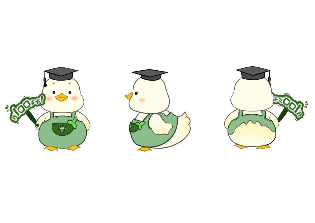 设计理念:作者设计的吉祥物鸭大er以中大的英文SUN YAT-SEN UNIVERSITY谐音为灵感,既以和谐有趣的方式表示了中大的卡通形象,也暗含了中大绿色生态环境中丰富的水鸟(白眉鸭、绿翅鸭)。吉祥物身上融入了双碳元素,寓意着环保概念与绿色发展的紧密结合。头戴的学士帽寓意着学子们在毕业季节迎接未来的挑战。中大的校徽和手持的“我100岁啦!”标语,符合校庆百年的欢庆氛围。