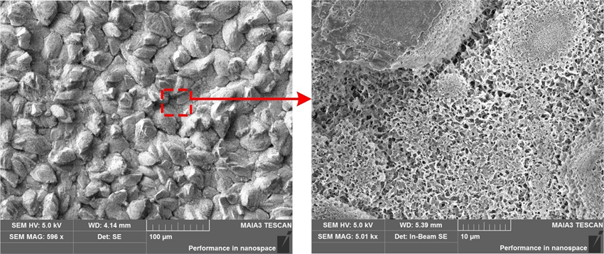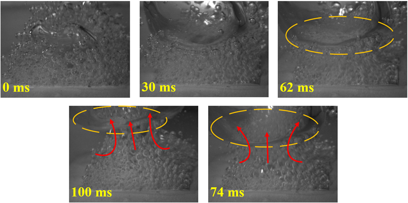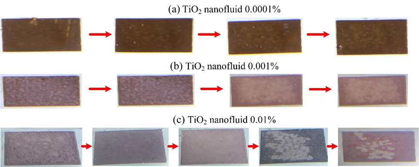 如图1所示,实验中观测得到固态添加剂的纳米颗粒的沉积现象,该沉积现象有助于形成多孔结构,保持毛细作用以提升临界沸腾密度。同时固体沉积层的随机脱落及其对沸腾现象长期稳定性的影响也得到探究。