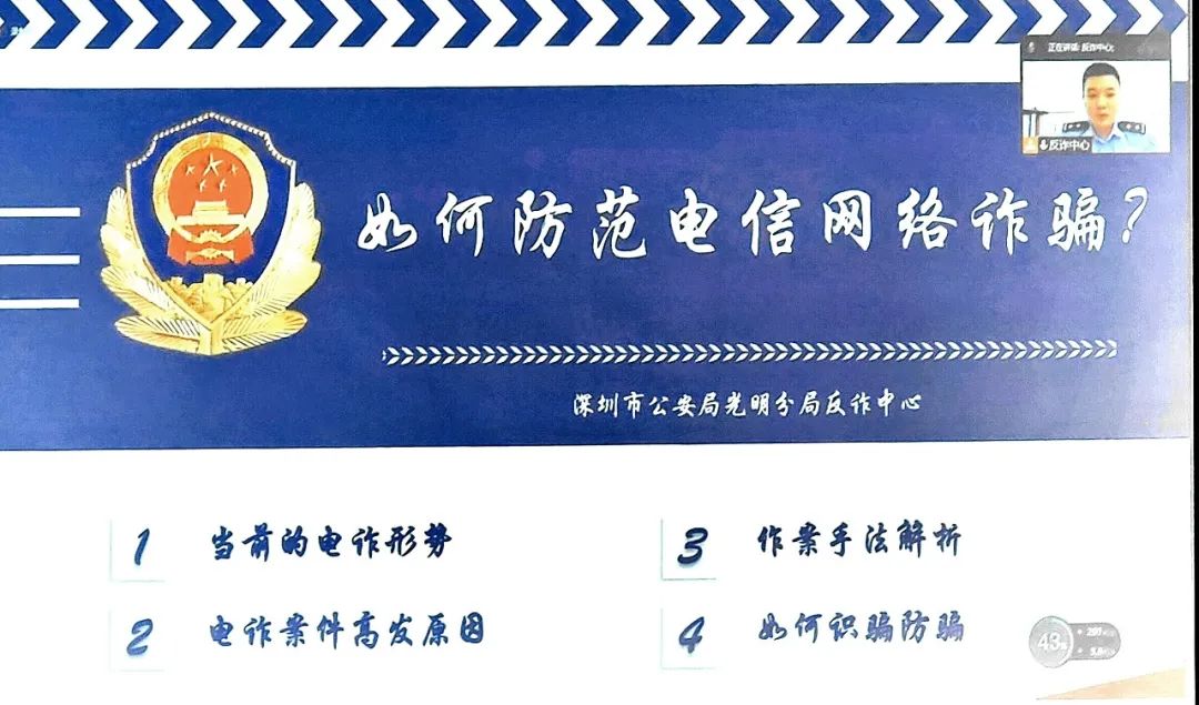 讲座内容包括当前电诈形式、电诈案件高发原因、作案手段、如何识骗防骗四个部分。