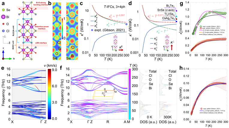 研究通过结合密度泛函计算和Wigner输运理论模型,计算了晶体Bi4O4SeCl2晶格热导率κL中类粒子(κp)和类波输运(κc)贡献成分(κL=κp+κc)。利用第一原理计算软件以及自主拓展开发的程序,克服了以往只考虑基态(0 K)下的原子间作用力常数弊端,本研究中严格计算了有限温度下的原子间作用力常数,从而将温度引起的声子重整化和非间歇性引入三声子、四声子以及缺陷散射对热导率影响的计算。研究发现在晶体Bi4O4SeCl2中:(1)沿着该晶体ab平面内,κL随温度的增加而增加,在某一温度时达到峰值,然后在声子-声子散射作用增加的情况下降低,且此时的κL~T -0.887,接近标准~T -1,表明该方向κL主要来源于类粒子传播的贡献;(2) 沿着垂直于ab平面(沿c)方向,κL在 20-300 K 的范围内随温度单调增加,此时的κL~T -0.071,几乎与 温度无关,这种非典型的温度依赖性表明该方向κL具有与类波传播相似的机制(与类粒子传播不同,类波传播没有振动模式,主要是通过类似Zener的隧道效应来传导热量),同时沿该方向的κL 室温下仅为0.17 W/mK ,是目前所报道的块状无机固体晶体材料中最低的热导率。通过分析该晶体中的声子散射率、声子群速度、平均自由程等特性,发现导致其超低热导率的根本原因是:Bi4O4SeCl2 结构沿着c方向由BiOCl 和 Bi2O2Se 层堆叠组成ABACC(即 Bi2O2-Se-Bi2O2-Cl-Cl)模块晶体构型,即形成了[Bi2O2]2+ 单元内的强键、Bi2O2Se 内[Se]2- 的晶体易变形键和[Cl]- 阴离子的弱范德华键的强弱键耦合,结果使得沿该方向的声子能带为平带,从而导致该方向的声子散射非简谐性显著增强且群速度被严重弱化。
