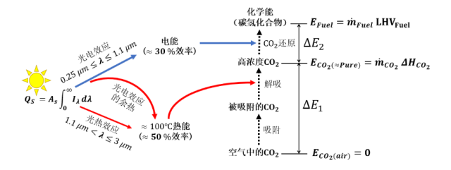 人工光合作用(Artificial Photosynthesis,AP) 是利用太阳能为唯一能源把CO2直接转化为高附加值化学燃料的能源技术。该技术在降低CO2排放的同时减少化石能源的消耗量,从而改善环境并解决能源短缺问题。AP主要包括热催化、光催化与电催化三种途径。其中,热催化在太阳辐照短波转化为热能的过程中产生较大的㶲损失,光催化和电催化只利用了部分高频率太阳波段 (分别为0.25 - 0.4 μm 与0.25 - 1.1 μm),造成了其他波段的能量浪费。另外,目前的AP研究大部分都是直接输入纯CO2,没有考虑CO2捕获和纯化的能量消耗。因此,目前的AP技术中,太阳能利用效率普遍较低。