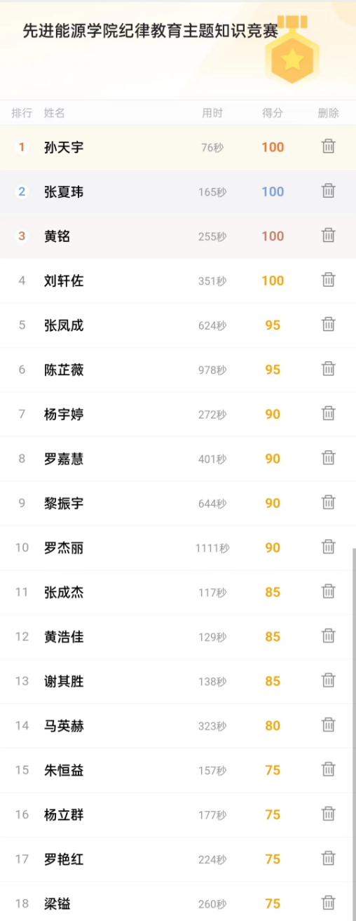 为增强大家的法治意识、纪律意识、规矩意识和安全意识,强化本次纪律教育学习月系列活动的效果,学院开展纪律教育主题知识竞赛。题目类型涵盖党和国家重要历史事件,互联网相关法律法规,宿舍管理条例,学校相关纪律要求等。2021级同学踊跃参与学院设置的纪律教育专题测试,参赛同学均通过测试,其中超半数同学得分在90分及以上、近1/4同学得满分,学习成效显著。