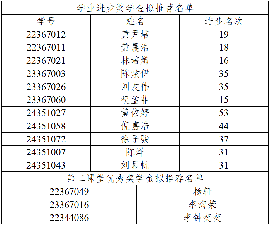 根据《党委学生工作部关于开展2024—2025学年本科生奖学金评选工作的通知》,按照全国学生资助管理中心的工作要求,结合我院实际,根据《中山大学本科生奖学金管理办法》(中大学生〔2023〕9号),《yl88858永利集团关于评选2024-2025学年中山大学专项奖学金的通知》,经个人申请、学院审核,拟推荐黄尹培等11人获学业进步奖学金,拟推荐李钟奕奕等3人获第二课堂优秀奖学金,现将具体名单予以公示。