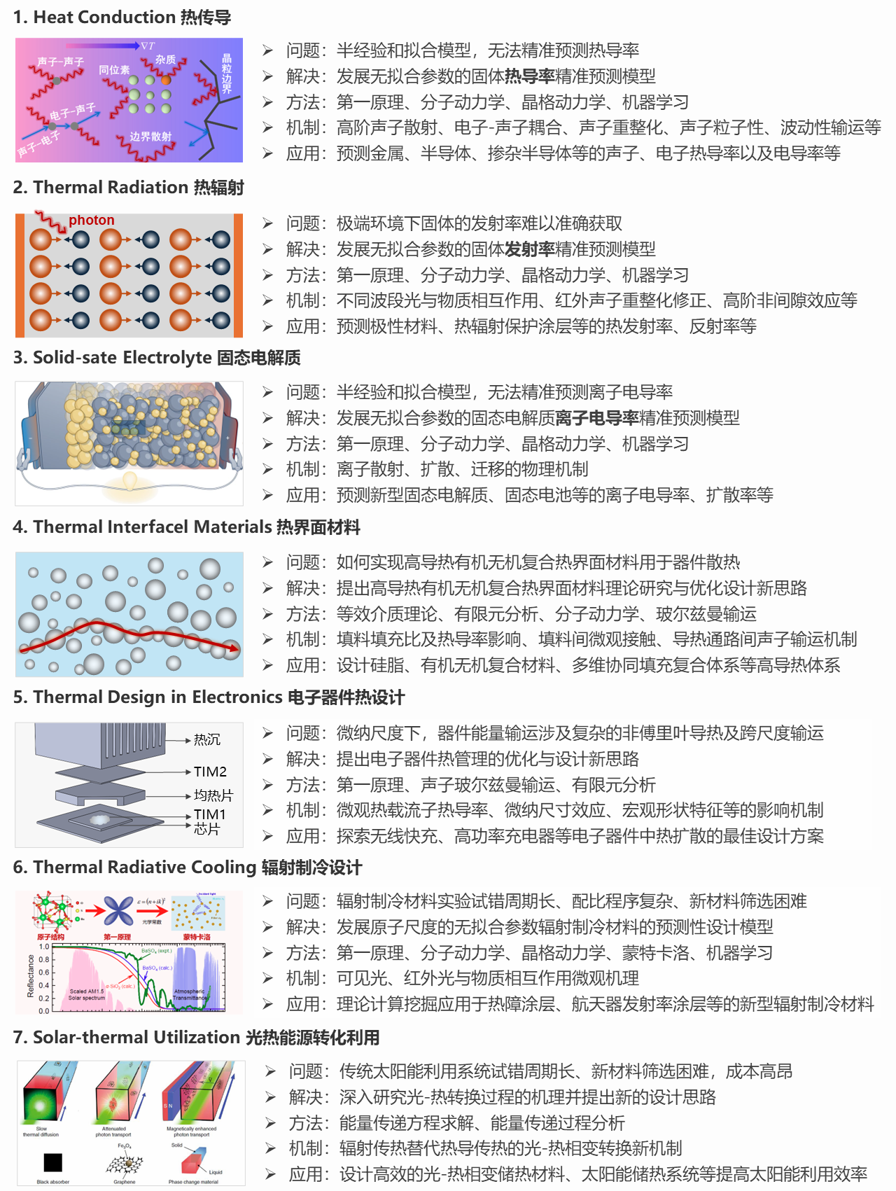 童贞主要从事微观尺度能量输运及能源利用研究(工程热物理和能源利用学科),主要关注热传导和热辐射的研究。在研究内容方面,课题组聚焦凝聚态物理、量子输运、先进能源材料、固态电池输运、电子器件热管理及热设计等与电子器件、物理、材料、化学、数据科学等领域的交叉融合前沿科学。在基础理论研究方面,课题组侧重发展多尺度的模拟计算方法(第一性原理、分子动力学、晶格动力学、非晶格动力学、格林函数、蒙特卡洛、机器学习等)研究材料热导率和发射率,包括电子和声子散射、声子重整化、电声耦合输运、缺陷热输运、电-热耦合输运、界面热输运、可见光吸收和红外光辐射等。在应用研究方面,课题组侧重开展光热转换及储能系统设计、辐射制冷材料设计、热界面复合材料设计、芯片内部散热设计、无线充电散热片设计、固态电池等涉及能量输运、转化以及利用方面的研究。