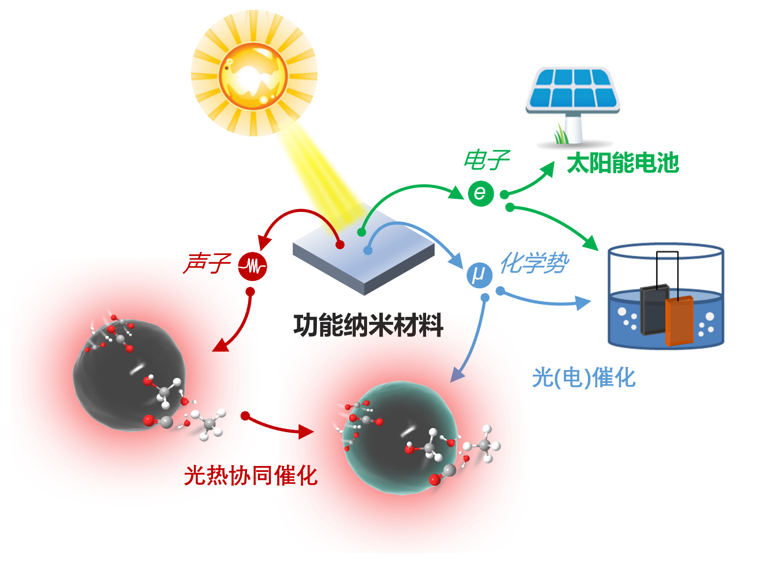功能纳米材料的可控制备与面向双碳目标的新型太阳能利用技术,包括光能-化学能转化(光催化、光电协同催化、光热协同催化)、光能-电能转化(太阳能电池)。
